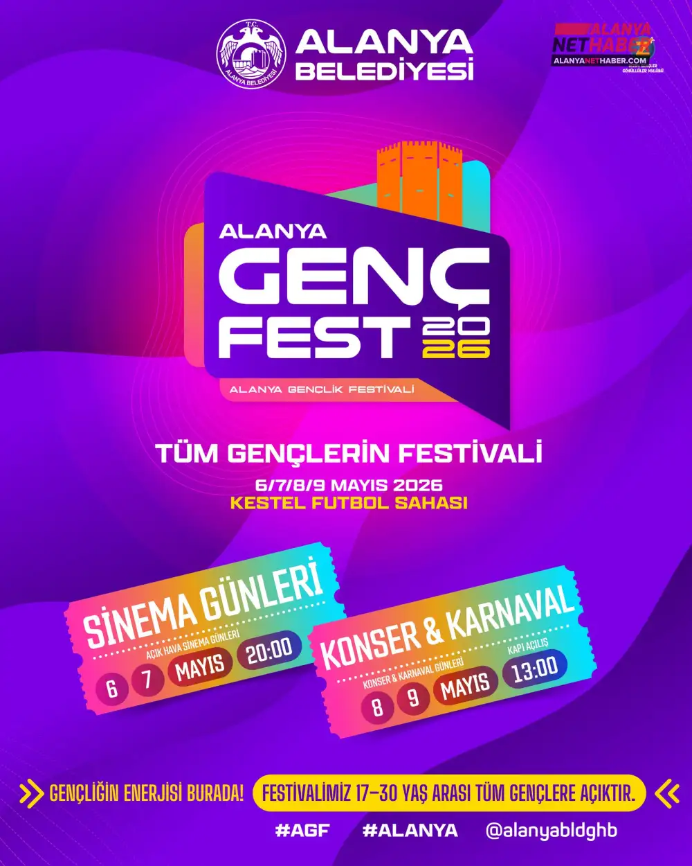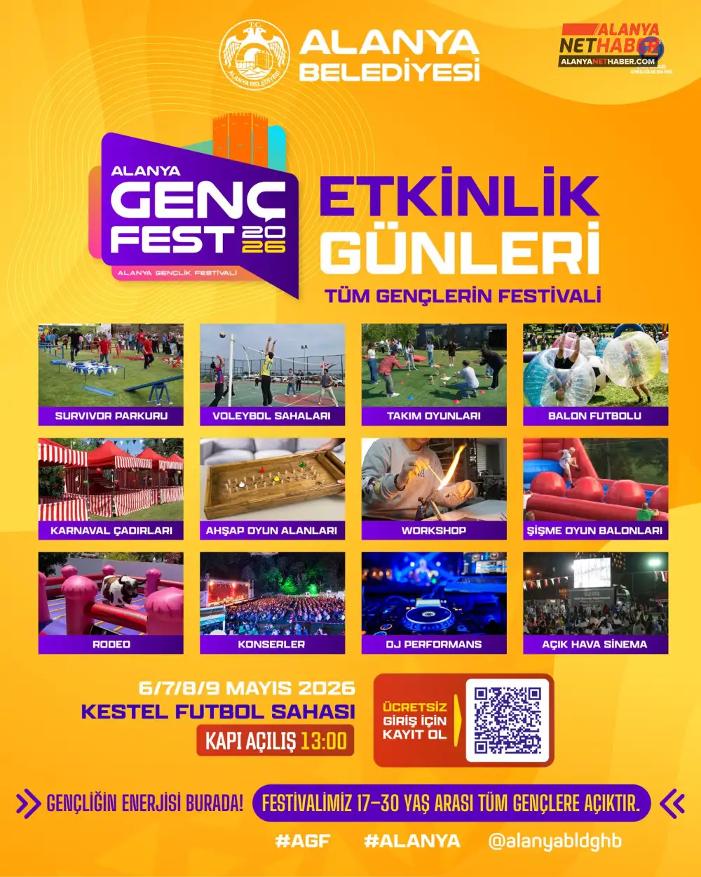 ألانيا تنظم البلدية منظمة كبرى ستجمع الشباب معًا من خلال الثقافة والفن والرياضة والترفيه. ويستعد المهرجان، الذي سيقام في ملعب كيستيل لكرة القدم في الفترة ما بين 6 و9 مايو 2026، لتوفير لحظات لا تنسى لجميع الشباب الذين تتراوح أعمارهم بين 17 و30 عامًا. لن يحتاج الشباب الذين يرغبون في المشاركة في الأحداث المجانية إلا إلى التسجيل عبر رمز الاستجابة السريعة.