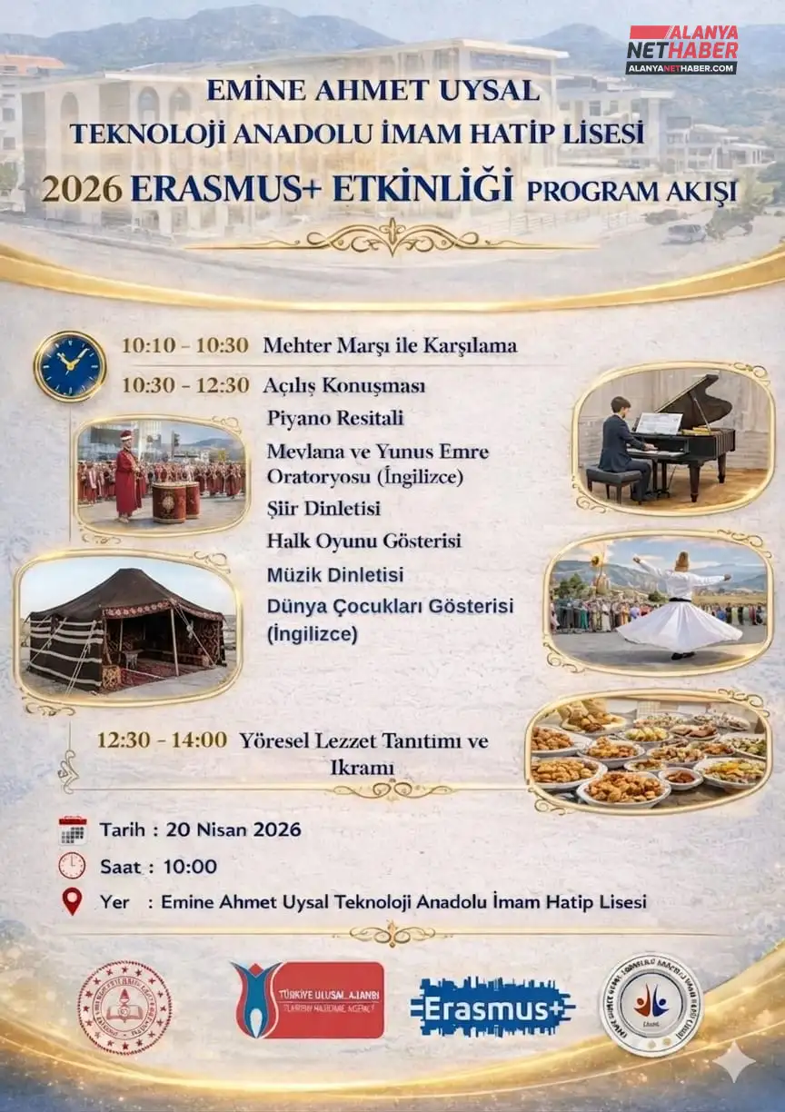 Alanya ilçesinde, 20-25 Nisan 2026 tarihleri arasında Avrupa'nın en geniş katılımlı Erasmus+ hareketliliklerinden biri başlıyor. Emine Ahmet Uysal Teknoloji Anadolu İmam Hatip Lisesi ev sahipliğinde gerçekleşecek olan programa; Türkiye, Polonya, Almanya, İtalya, Fransa, İspanya ve Romanya sınırlarından toplam 97 öğrenci ile öğretmen katılacak. Eğitim, kültür ve teknolojiyi harmanlayan bu büyük buluşma, bölgedeki lise düzeyinde gerçekleştirilen en kapsamlı uluslararası proje olarak dikkat çekiyor.
