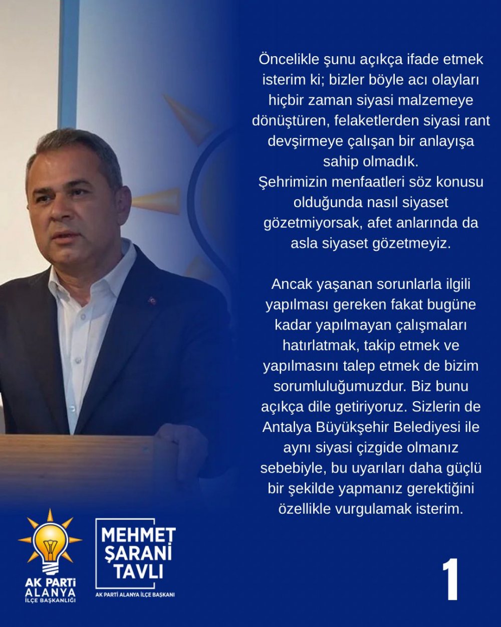AK Parti Alanya İlçe Başkanı Mehmet Şarani Tavlı, son sel felaketinin ardından Alanya genelinde yaşanan altyapı sorunlarına ilişkin açıklamalarda bulundu. Tavlı, afet durumlarının siyasete malzeme edilmemesi gerektiğini vurgularken, Büyükşehir Belediyesi’nin görev alanındaki eksiklerin kamuoyuyla paylaşılmasının sorumlulukları olduğunu ifade etti. Tavlı, özellikle 2014’ten bu yana yürürlükte olan Büyükşehir Yasası gereği yağmur suyu drenaj hatlarının Antalya Büyükşehir Belediyesinin sorumluluğunda olduğunu hatırlattı.