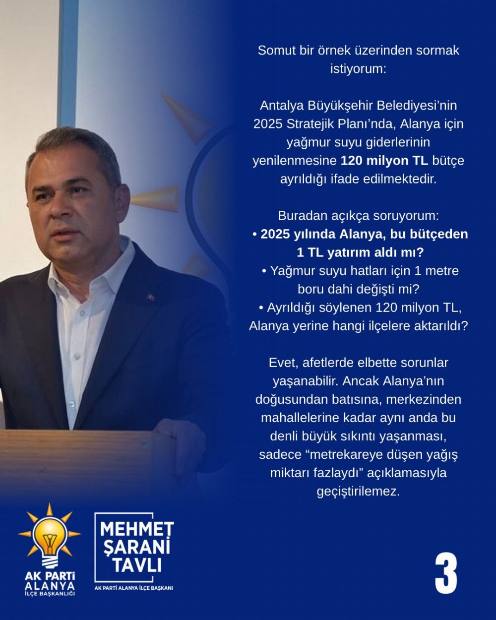Tavlı, son yağışlarda Alanya genelinde aynı anda yaşanan sorunların yalnızca “yağış miktarı fazlaydı” açıklamasıyla geçiştirilemeyeceğini belirtti. Antalya Büyükşehir Belediyesinin 2025 Stratejik Planı’nda Alanya için belirtilen 120 milyon TL’lik yağmur suyu gideri yenileme bütçesine dikkat çeken Tavlı, bu bütçeden Alanya’nın pay alıp almadığını sordu. Tavlı, “2025 yılında Alanya bu bütçeden 1 TL yatırım aldı mı?” diyerek kamuoyunun bilgilendirilmesi gerektiğini vurguladı.