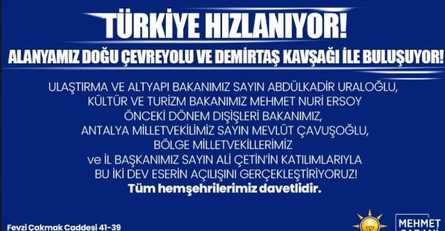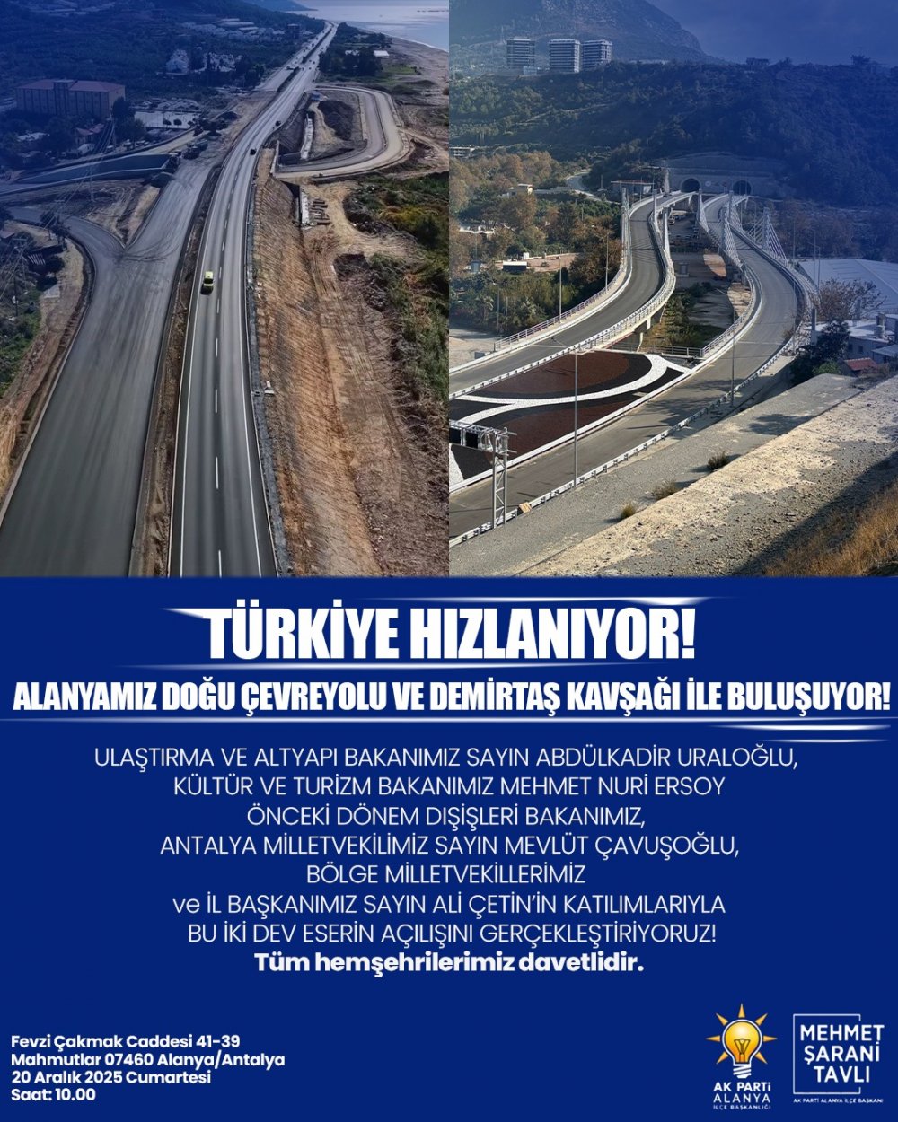 AK Parti Alanya İlçe Başkanı Mehmet Şarani Tavlı, projelerin Alanya için büyük bir kazanım olduğunu belirterek tüm vatandaşları açılış törenine davet etti. Tavlı, Doğu Çevre Yolu ve Demirtaş Kavşağı’nın bölge trafiğini rahatlatacağını ve Alanya’nın gelişimine önemli katkı sağlayacağını ifade etti.