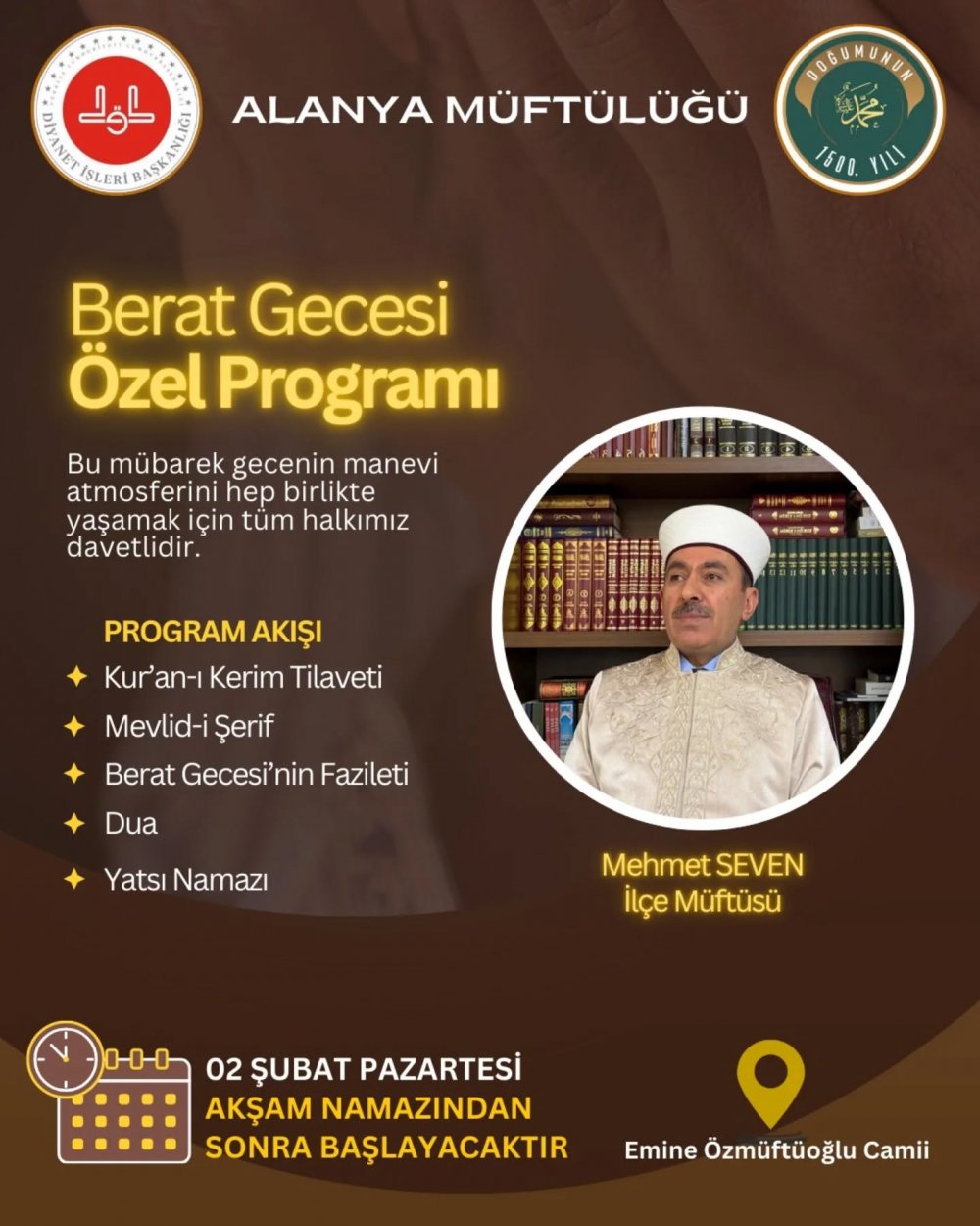 İlçe Müftüsü Mehmet Seven, programda "Berat Gecesi’nin Fazileti" üzerine bir konuşma gerçekleştirecek. Seven, bu gecenin bağışlanma ve arınma gecesi olduğunu vurgulayarak, Alanyalı hemşehrilerinin bu kutsal zaman diliminde bir araya gelmesinin önemine dikkat çekti. Program, yatsı namazının kılınmasıyla birlikte sona erecek.