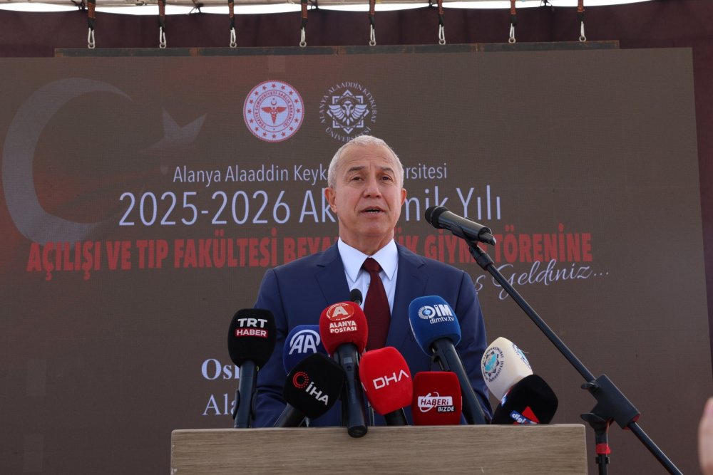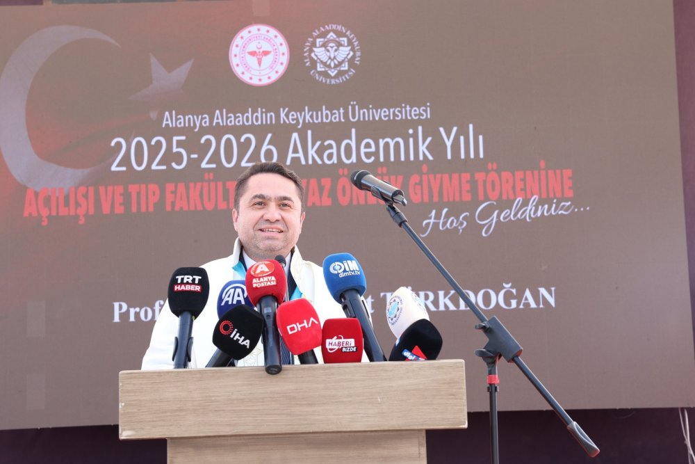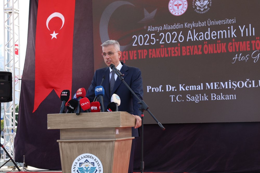 Alanya Alaaddin Keykubat Üniversitesi (ALKÜ) 2025-2026 Akademik Yılı Açılış Töreni, İlk Ders ve Tıp Fakültesi Beyaz Önlük Giyme Töreni, Sağlık Bakanı Prof. Dr. Kemal Memişoğlu’nun katılımıyla büyük bir coşkuyla gerçekleştirildi. Kestel Amfitiyatro’da düzenlenen törene Antalya Vali Vekili Salih Yüce, Antalya Milletvekili Tuba Vural Çokal, ALKÜ Rektörü Prof. Dr. Kenan Ahmet Türkdoğan, Alanya Kaymakamı Şakir Öner Öztürk, Alanya Belediye Başkanı Osman Tarık Özçelik, İl Sağlık Müdürü Prof. Dr. Behçet Özkan, STK ve siyasi parti temsilcileri, akademisyenler, öğrenciler ve vatandaşlar katıldı.