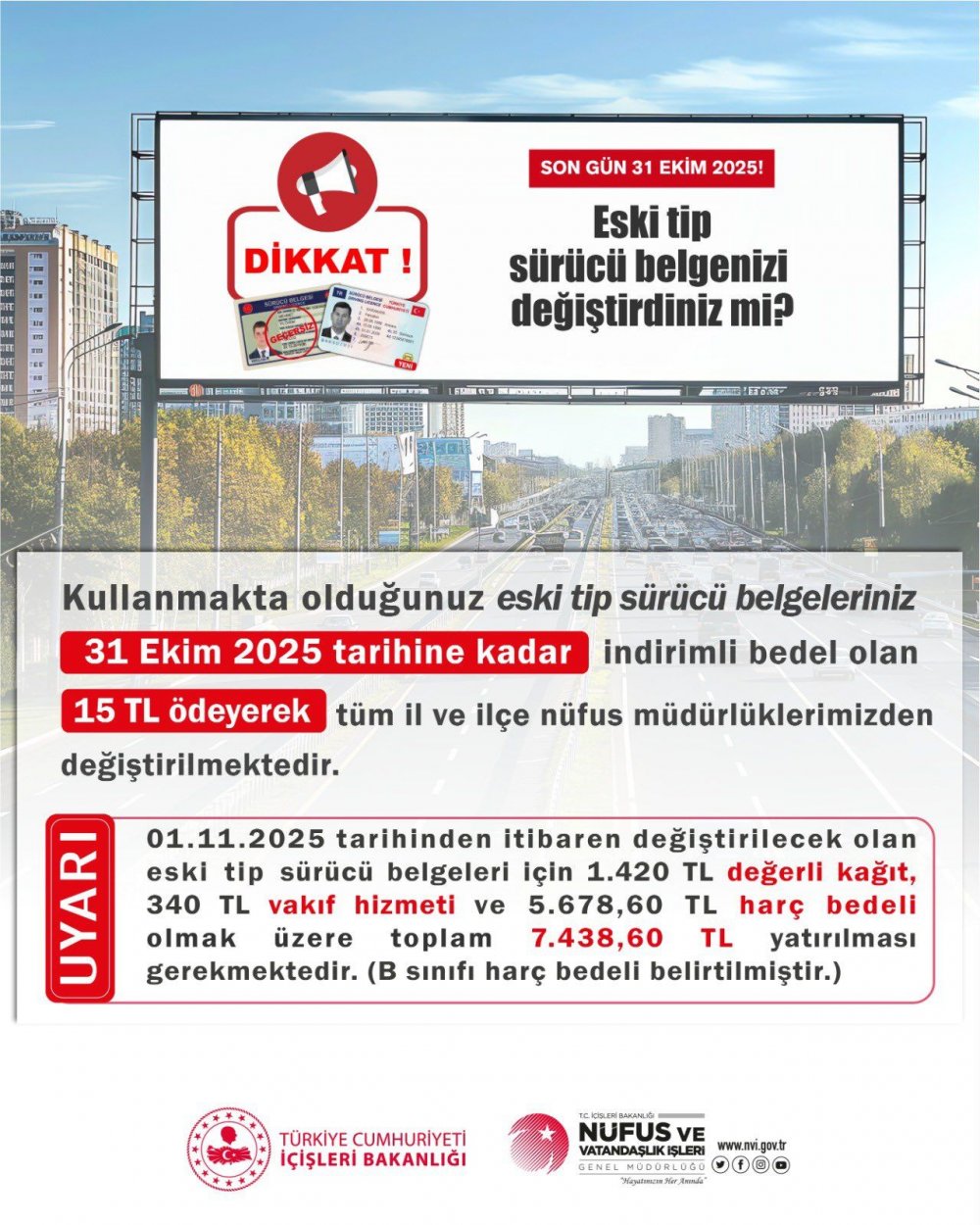 Alanya Kaymakamlığı tarafından yapılan açıklamada, eski tip sürücü belgesi sahiplerinin zamanında başvuruda bulunarak mağduriyet yaşamamaları istendi. Yenileme işlemleri için Alo 199 hattı, randevu.nvi.gov.tr adresi veya e-Devlet sistemi üzerinden randevu alınabileceği belirtildi.