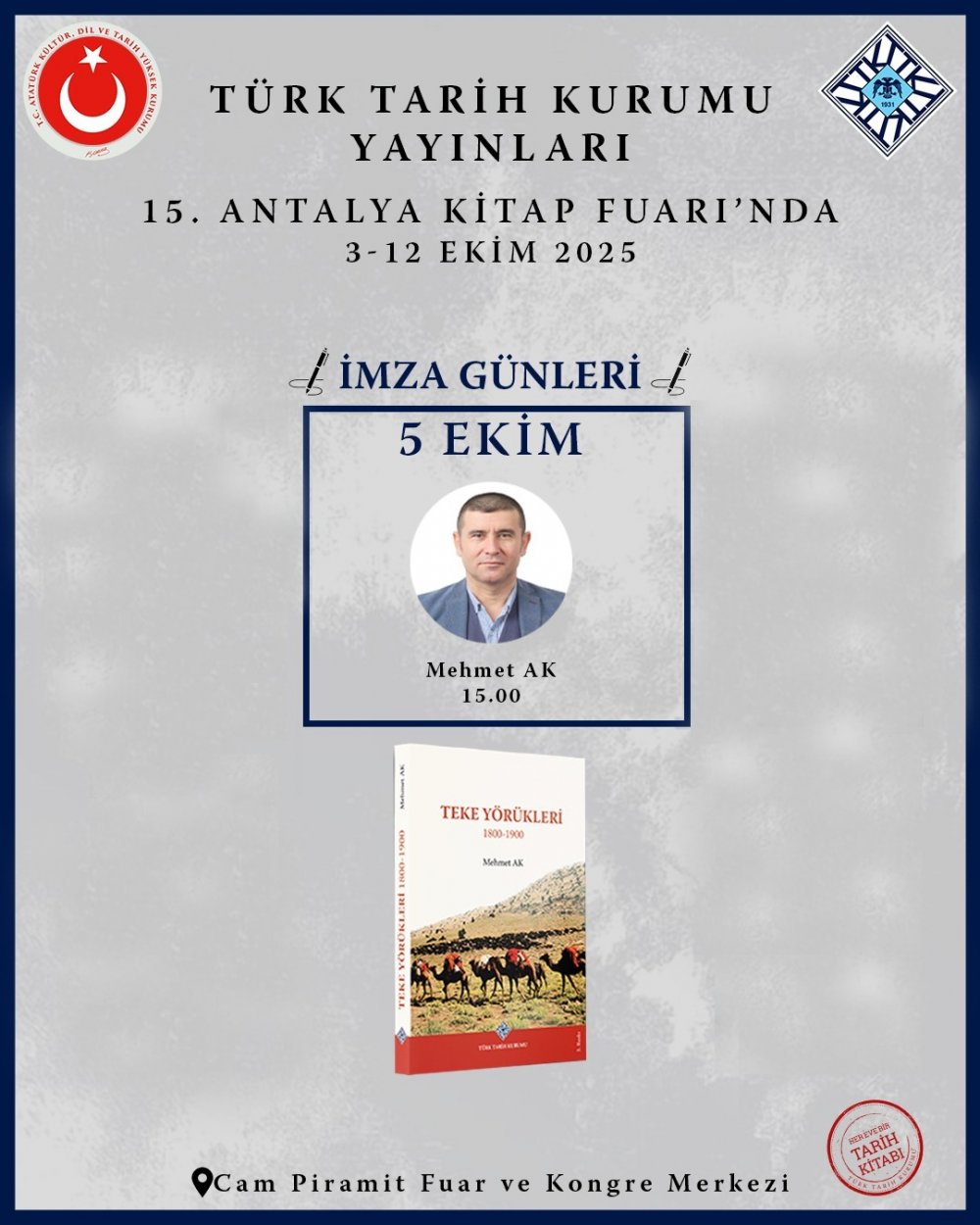 03-12 Ekim tarihleri arasında Antalya Cam Piramit Fuar ve Kongre Merkezi’nde gerçekleşen fuara katılacak olan Prof. Dr. Ak, 5 Ekim Pazar günü saat 15.00’te Türk Tarih Kurumu Yayınları standında okurlarıyla bir araya gelecek. Yazar, “Teke Yörükleri (1800-1900)” adlı eserini imzalayacak.