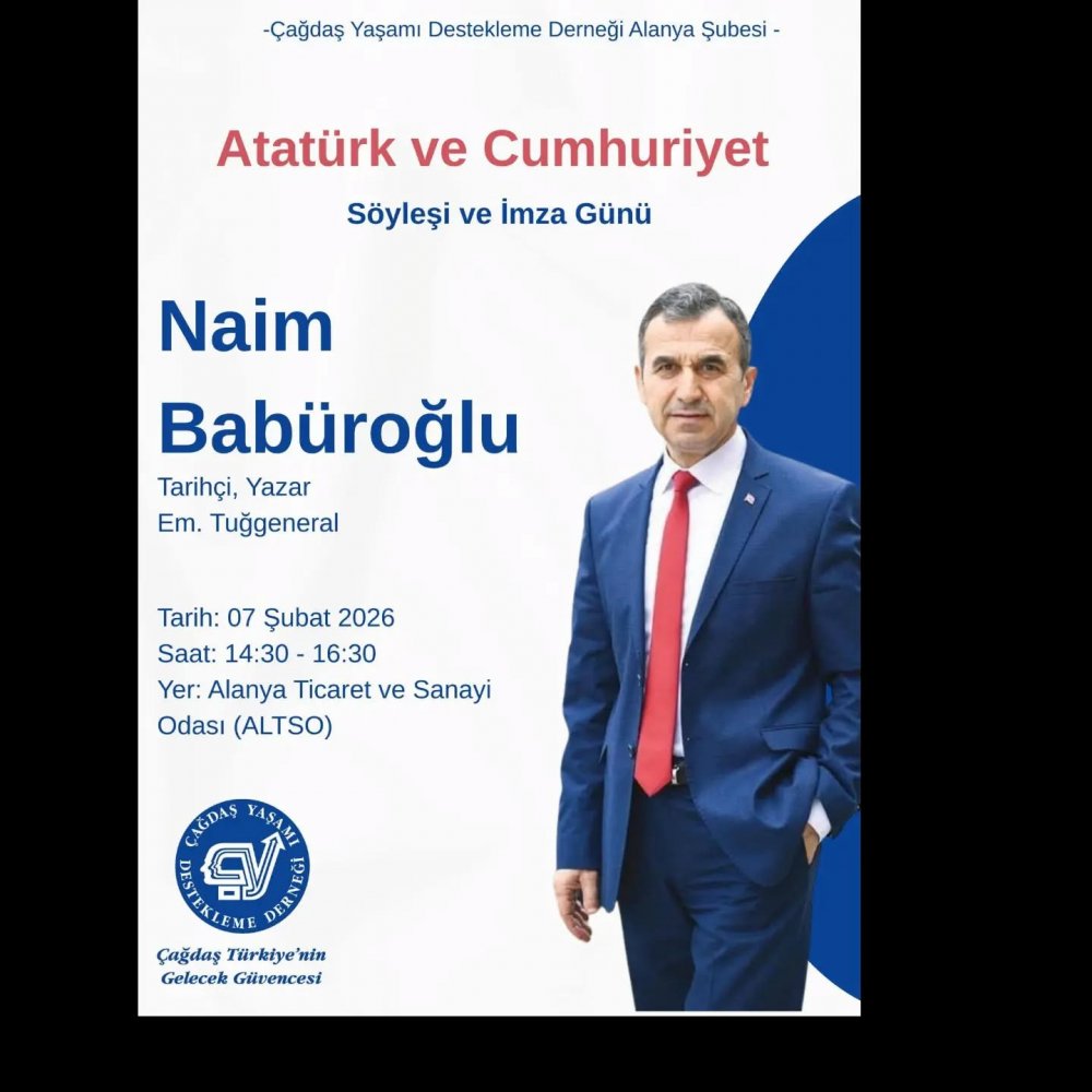 Çağdaş Yaşamı Destekleme Derneği (ÇYDD) Alanya Şubesi, kültürel etkinlikler kapsamında önemli bir buluşmaya imza atmaya hazırlanıyor. Tarihçi, yazar ve Emekli Tuğgeneral Naim Babüroğlu, düzenlenecek özel etkinlikte Alanyalı vatandaşlarla bir araya gelecek.