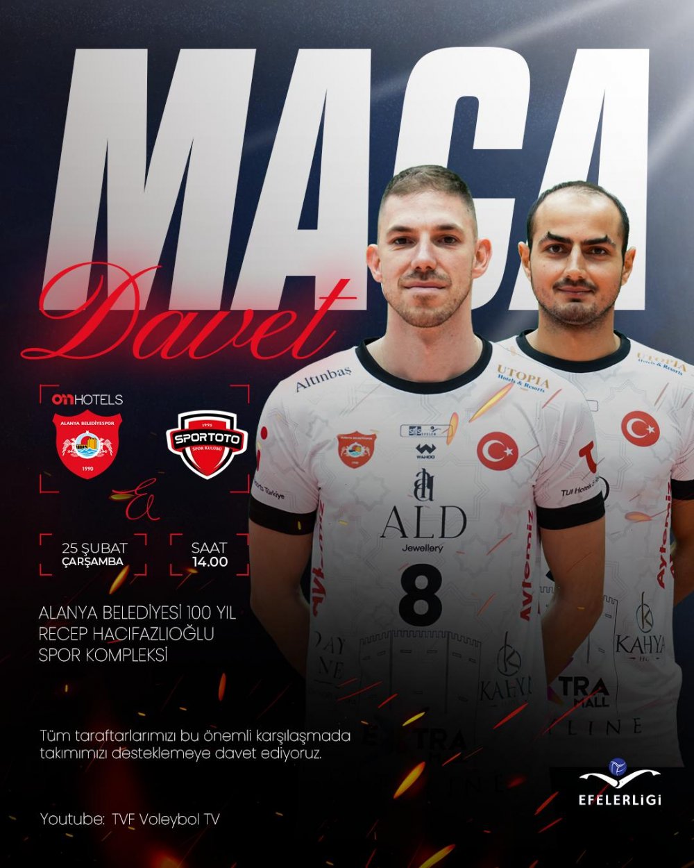 Efeler Ligi temsilcisi On Hotels Alanya Belediyespor, ligin önemli karşılaşmalarından birinde Spor Toto’yu Alanya’da ağırlamaya hazırlanıyor. 25 Şubat Çarşamba günü gerçekleştirilecek olan mücadele, Alanya 100. Yıl Recep Hacıfazlıoğlu Spor Salonu’nda oynanacak. Saat 14.00’te başlayacak olan maçta Alanya ekibi, saha avantajını kullanarak hanesine puan yazdırmayı hedefliyor.